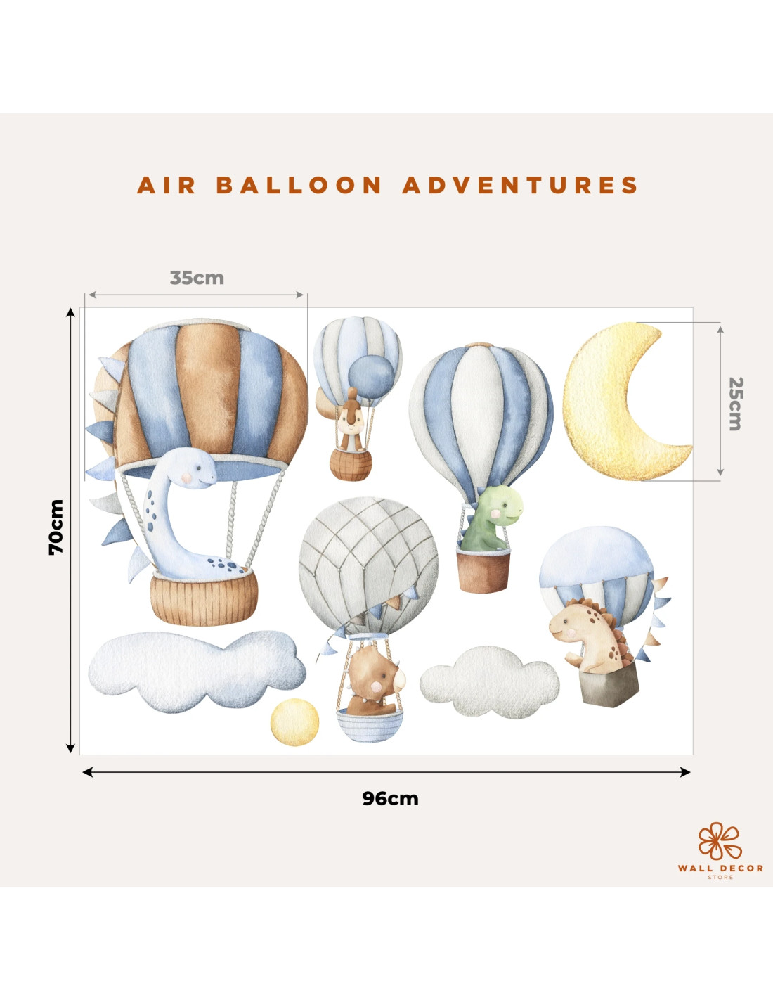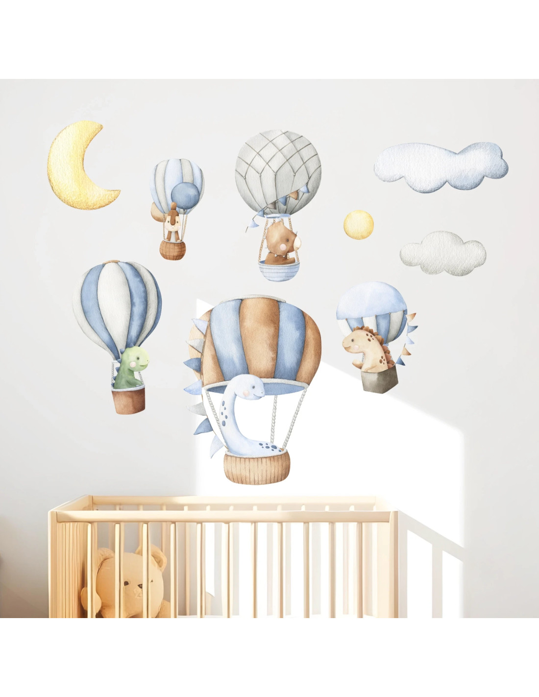 Set di adesivi da muro composto da 5 mongolfiere con dinosauri, 2 nuvolette, 1 sole e 1 luna in stile watercolor.