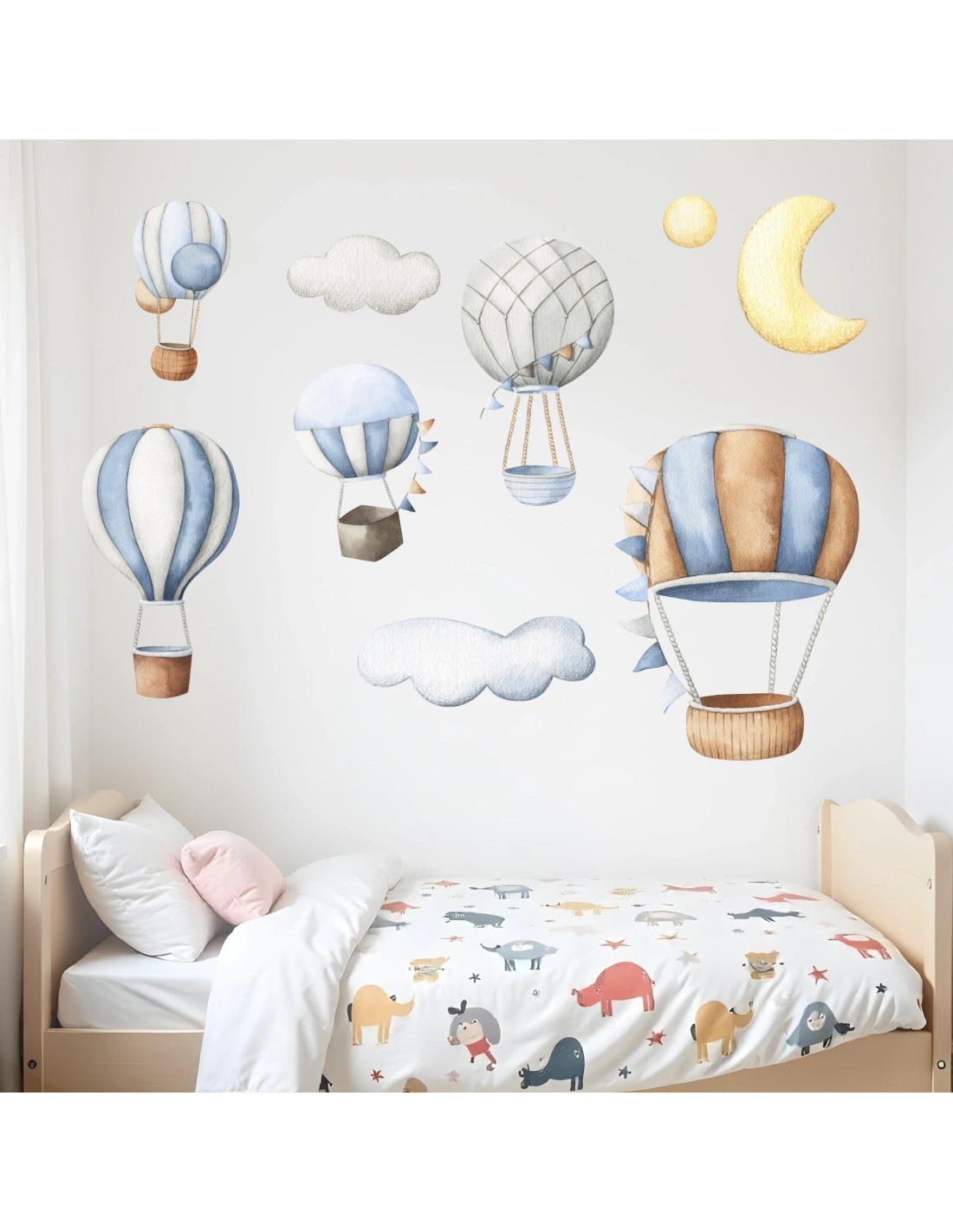 Set di adesivi da muro composto da 5 mongolfiere, 2 nuvolette, 1 sole e 1 luna in stile watercolor.
