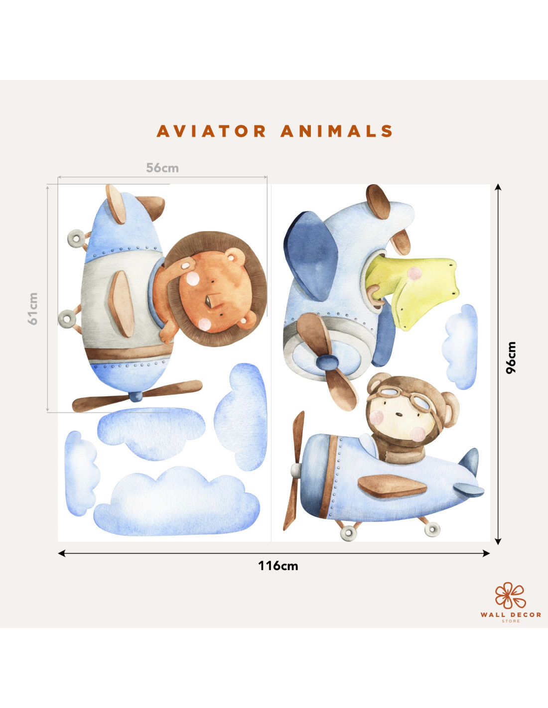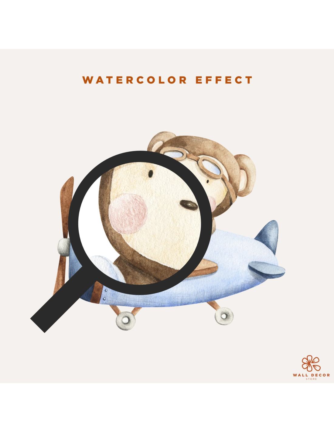Set di adesivi da muro composto da orso, leone e coccodrillo sui loro piccoli aerei, 3 nuvole in stile watercolor.