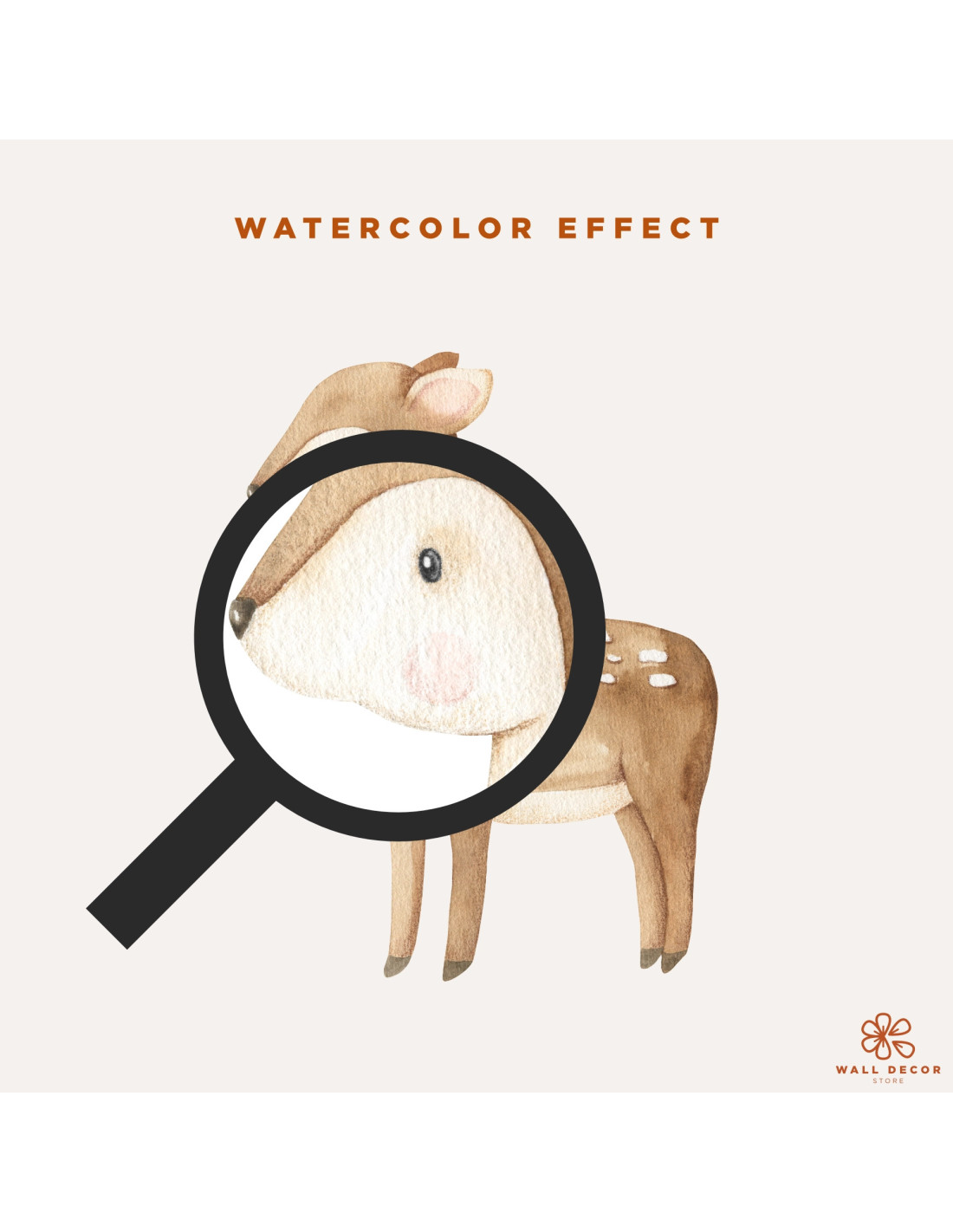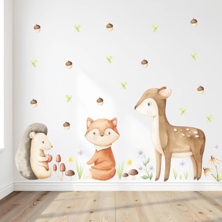 Set di adesivi da muro composto da 1 riccio, 1 volpe, 1 cerbiatto, 15 ghiande, 5 funghi, 9 trifogli, 5 ciuffetti d'erba, 2 rametti di fiori, 4 fiori viola, 5 fiori gialli in stile watercolor.