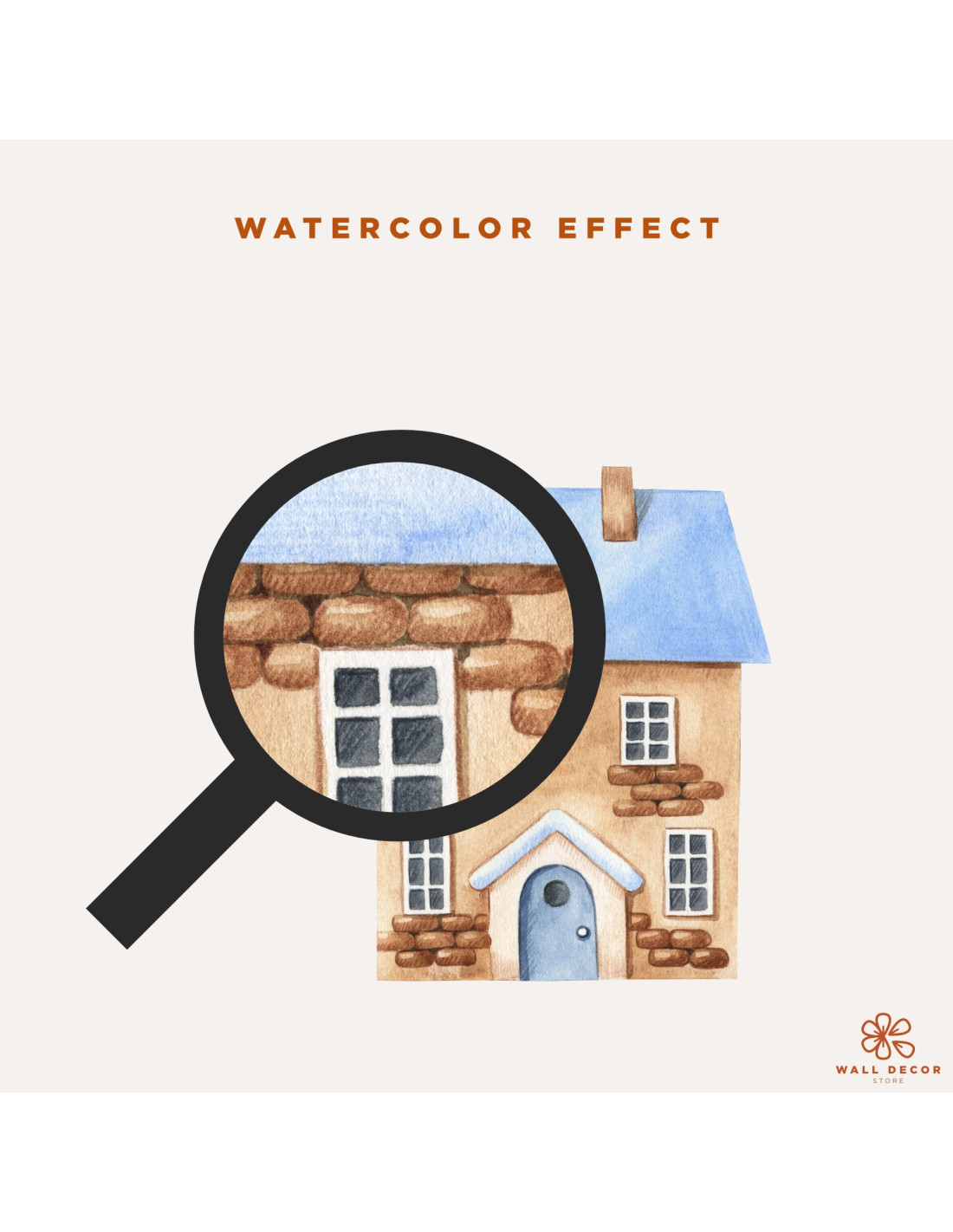 Set di adesivi da muro composto da una serie di casette di grandi dimensioni in stile watercolor.