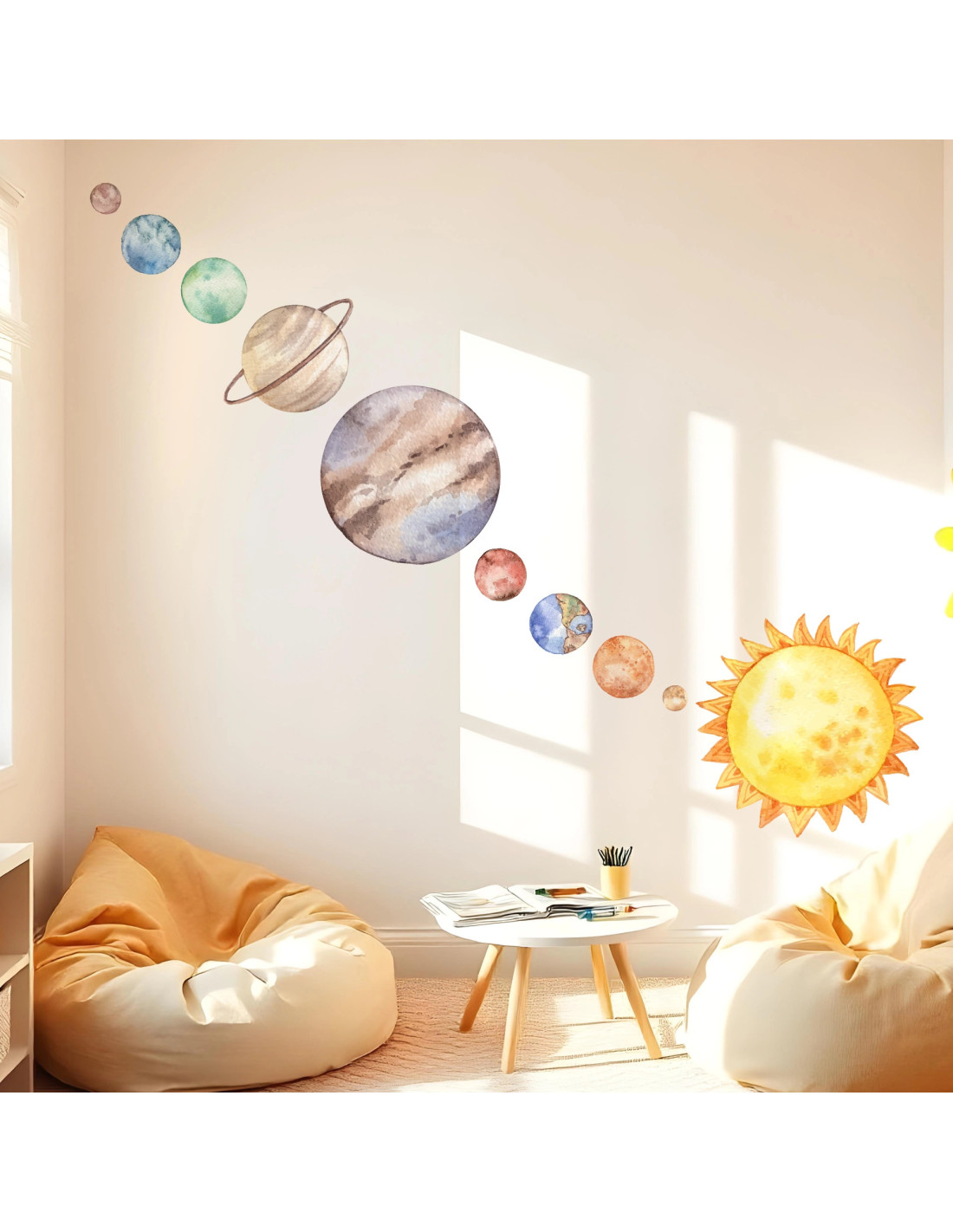Set di adesivi composto da 10 pianeti del sistema solare in stile watercolor.